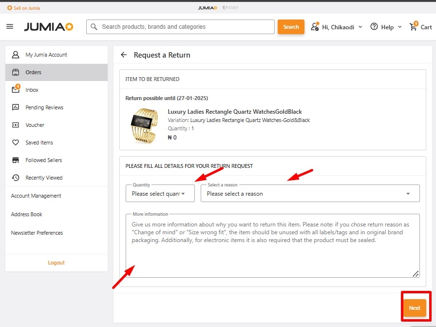 Step 4:Select the quantity and return reason. Give more details to help us understand the issue and proceed to click on "Next".