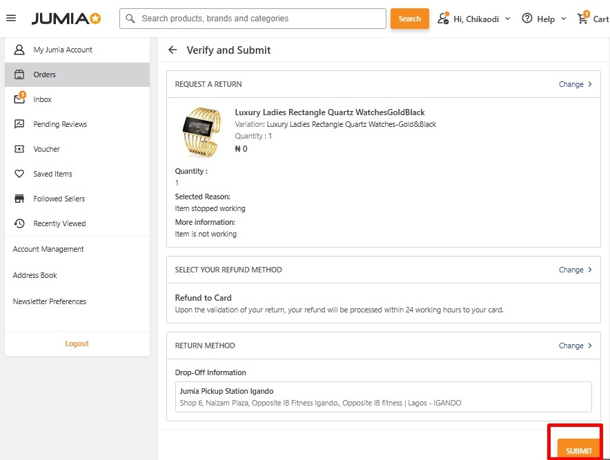 Step 1:Log in to your Jumia account and click on "ORDERS".