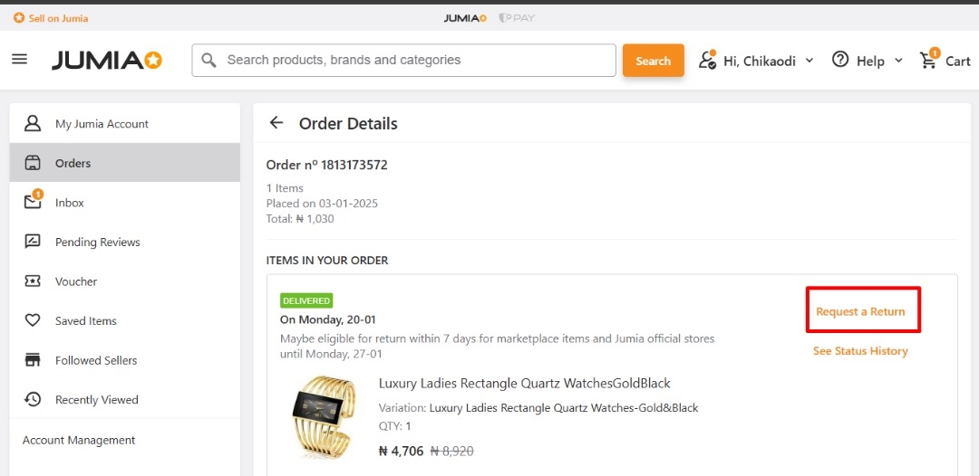 Step 1:Log in to your Jumia account and click on "ORDERS".